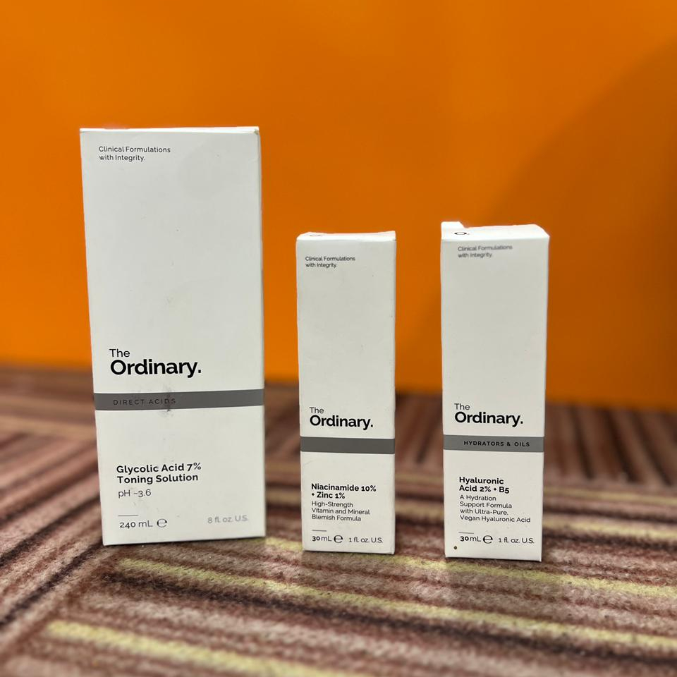 This curated selection from The Ordinary features three of the brand’s most iconic “functional beauty” products, emphasizing transparency and high-concentration active ingredients.Glycolic Acid 7% Toning Solution: A potent exfoliating toner that targets the skin surface to improve clarity and visible texture. With continued use, it helps even out skin tone and provides a gentle glow.Niacinamide 10% + Zinc 1%: A high-strength vitamin and mineral blemish formula. Niacinamide (Vitamin B3) is known to reduce the appearance of skin congestion and balance visible sebum activity, while Zinc helps soothe the skin.Hyaluronic Acid 2% + B5: A water-based formula combining low-, medium-, and high-molecular-weight hyaluronic acid molecules. This ensures hydration penetrates multiple layers of the skin, supported by Vitamin B5 for enhanced surface moisture.Together, these products form a comprehensive regimen for those looking to address dullness, textural irregularities, and dehydration using science-backed ingredients.MADE IN CANADAKey Responsibilities (Product Management/Curation)Regimen Design: Strategizing the safe application order of active ingredients (Exfoliation → Treatment → Hydration) to ensure maximum efficacy without irritation.Ingredient Analysis: Evaluating pH levels (e.g., ensuring the Glycolic Acid maintains its ~3.6 pH) and ingredient compatibility to prevent “pilling” or negative chemical interactions.Consumer Education: Providing clear guidance on sun sensitivity—specifically emphasizing the need for SPF when using the Glycolic Acid toner.Quality Assurance: Monitoring packaging integrity and batch consistency for clinical-grade serums and solutions.Visual Merchandising: Presenting the products in a clean, minimalist aesthetic that aligns with the “Clinical Formulations with Integrity” brand identity.